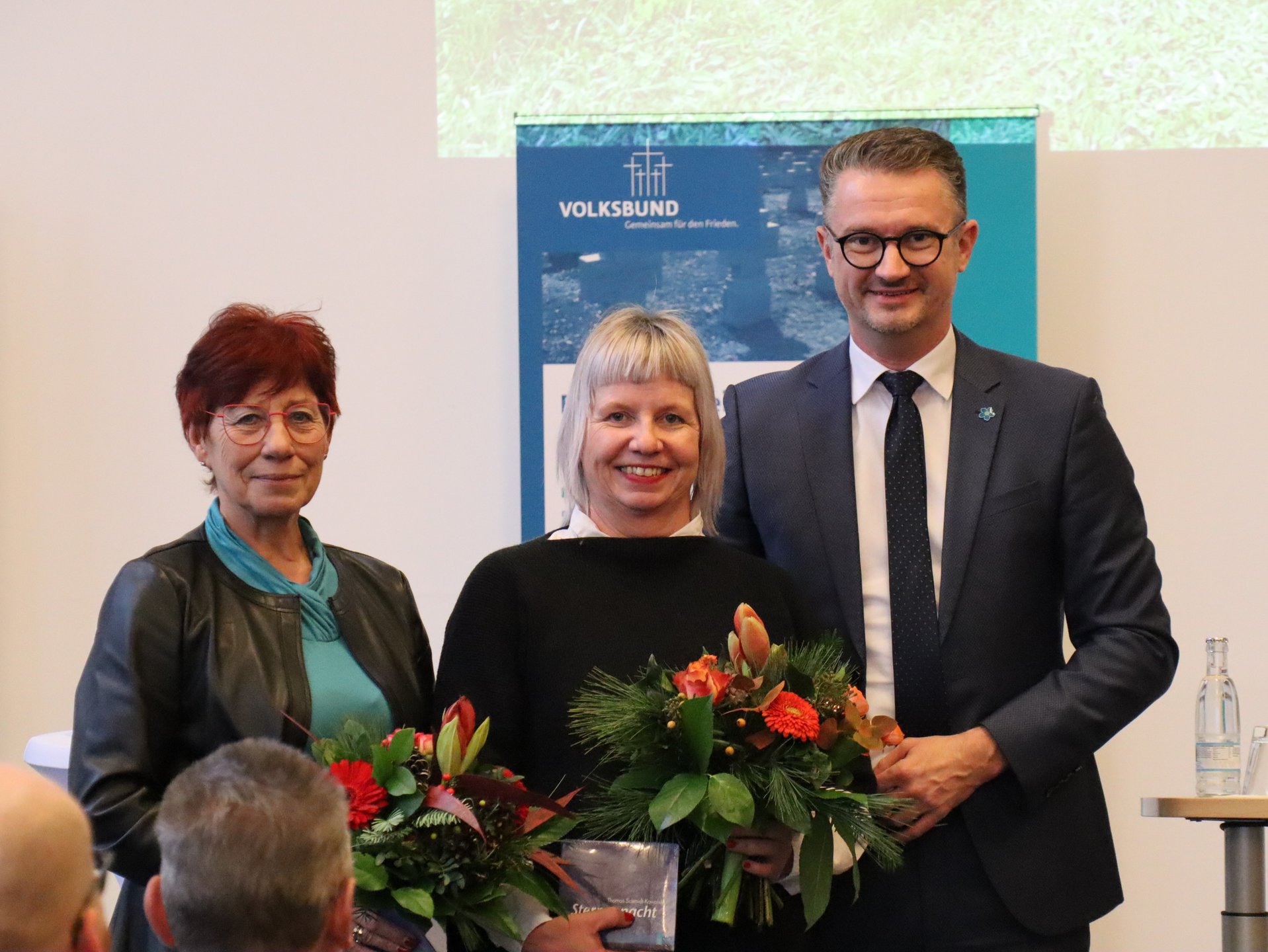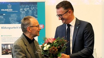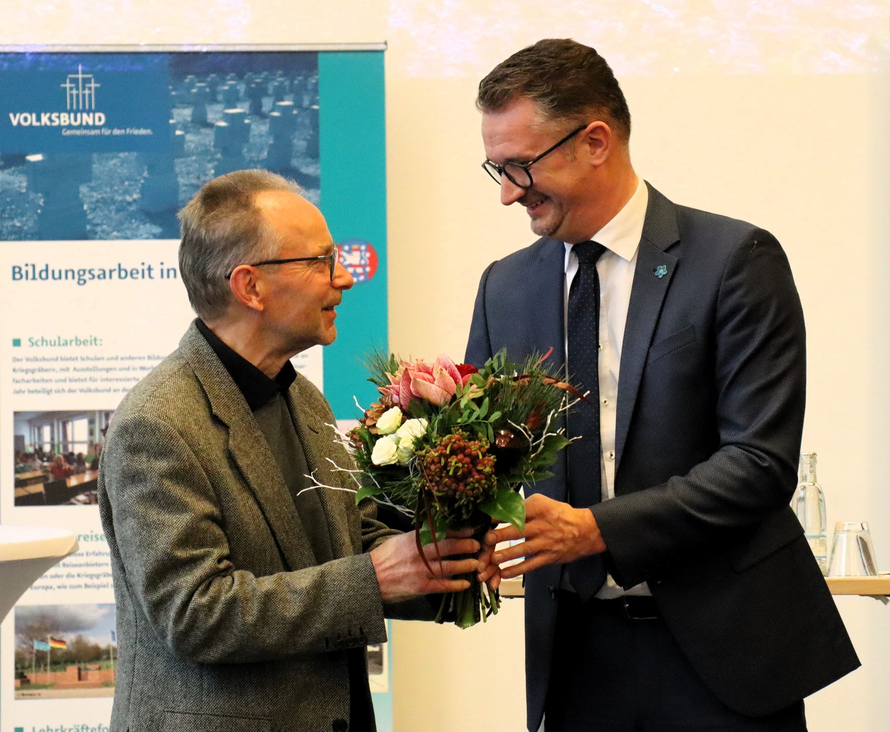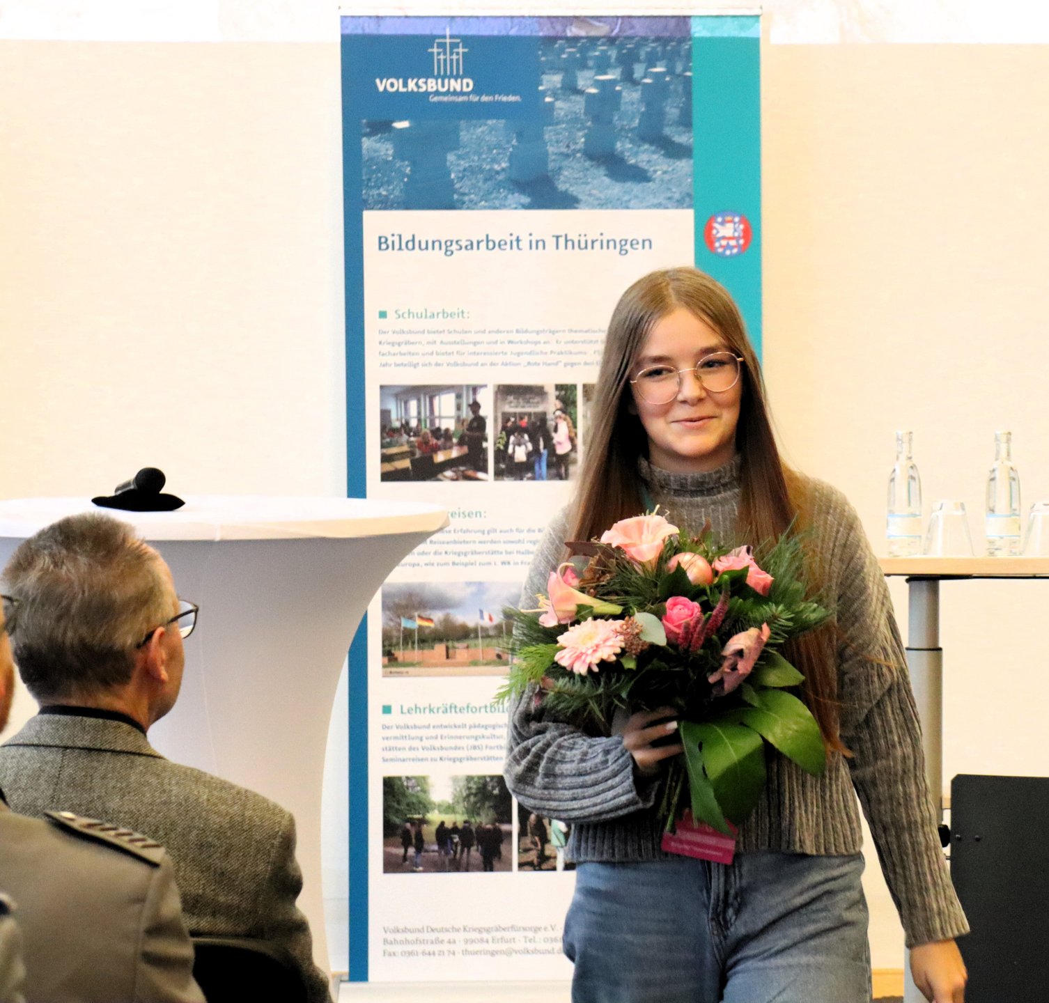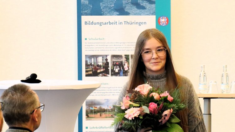Auch ein Geburtstagskind war unter den Schülerinnen und Schülern, die zur Dankeveranstaltung nach Erfurt angereist waren. Alina Noll bekam vom Landesvorsitzenden des Volksbundes, Christian Tischner, einen Blumenstrauß. Damit war ihr 15. Geburtstag definitiv ein Highlight, denn wann ist man schonmal im Thüringer Landtag und bekommt wegen seiner guten Tat eine Ehrung? Aber Alina war nicht die Einzige, die Geburtstag hatte, auch der ehemalige Vorsitzende des Volksbund Thüringens, Dr. Michael Krapp hat vor wenigen Tagen seinen 80. Geburtstag gefeiert.