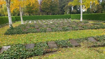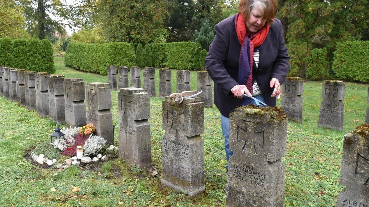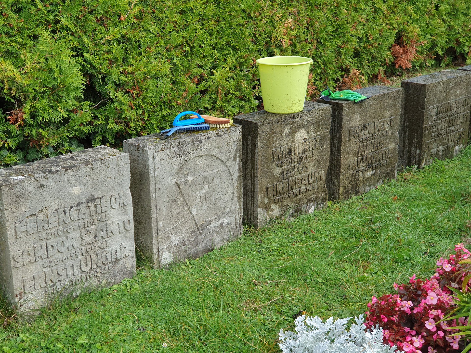 Die Grabanlage des sowjetischen Friedhofs war von Efeu umschlungen, welches sich störrisch mit der Heckenschere beseitigen ließ. Unter dem Efeu konnte man vor lauter Moos kaum noch die Inschriften der Grabsteine erkennen, weshalb hier Schaber und die Stahlbürste zum Einsatz kamen. Langsam kamen die Namen zum Vorschein, die hier verdeckt wurden. Die meisten der sowjetischen Toten, die hier liegen, starben den unmenschlichen Arbeitsbedingungen, der mangelnden Hygiene und den Schikanen der Wachmannschaften. Auch die Gräber der deutschen Soldaten und Bombenopfer wurden ordentlich entmoost, hier hatte sich glücklicherweise noch keine dichte Moosschicht gebildet. Auch die Gräber der Opfer des Nationalsozialismus ließen sich gut wieder instand setzen. Nach vier Stunden Arbeit ging es dann für die Teilnehmerinnen und Teilnehmer zum wohlverdienten Mittagessen ins Restaurant Paganini, wo man sich aufwärmte und regen Tischgesprächen nachging.